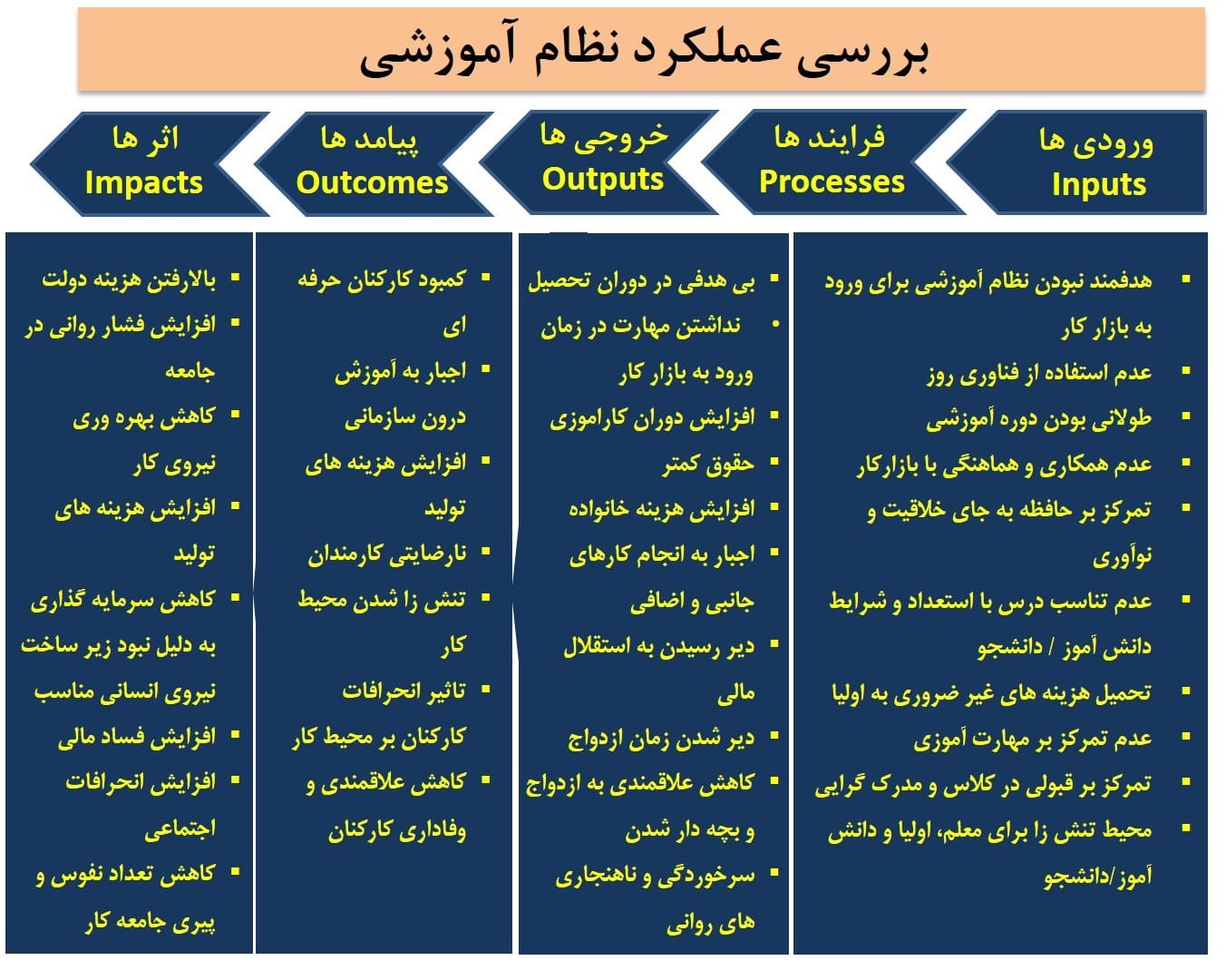 برای تحلیل این فرآیند آموزشی باید درنظر داشت که نظام آموزشی کشور که بسیار کلان است به اهداف تعریف شده برای مشتریان و اثرکنندگان و ذینفعان این دانش میرسد یا خیر و اثرات مثبت و منفی آن چیست؟ اگر این امر انجام میشود و اهداف محقق می شود با چه قیمت و هزینه ای و این هزینه در جامعه چقدر است؟ چقدر از سرمایه، داراییها و ثروت جامعه در این امر هزینه میشود؟