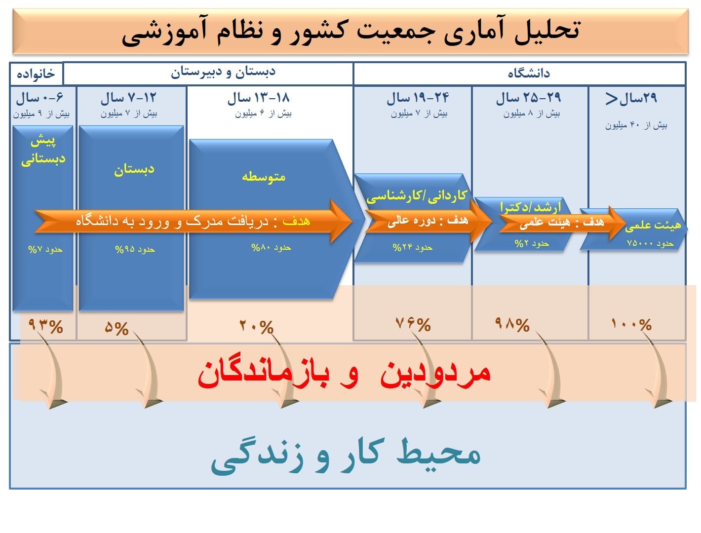 آنطور که آمارها نشان می دهد جمعیت دانش آموز در مقطع پیش دبستانی حدود 9 میلیون نفر است که از این تعداد حدود 7 درصد وارد نظام آموزشی می شوند. اما بیش از 95 درصد از جمعیت بالای 7 میلیون نفری 7 تا 12 ساله وارد دبستان می شوند همچنین 80 درصد از جمعیت 13 تا 18 سال به مدرسه می روند. از جمعیت 19 تا 24 سال نیز حدود 7 میلیون نفر در مقطع کاردانی و کارشناسی تحصیل می کنندکه حدود 24 درصد از جمعیت اصلی را شامل می شود. در این میان فقط 2 درصد از جمعیت 25 تا 29 سال در مقطع کارشناسی ارشد تحصیل می کند همچنین بیش از 7 هزار نفر از جمعیت 29 ساله عضو هیات علمی هستند. این درحالی است که آماری از خروج دانش آموزان در مقطع بعد از دوره دبستان وجود ندارد و این تعداد شامل کودکان کار می شود که نظام آموزشی نتوانسته آنها را جذب کرده و به مقطع بالاتر تحصیلی هدایت کند.