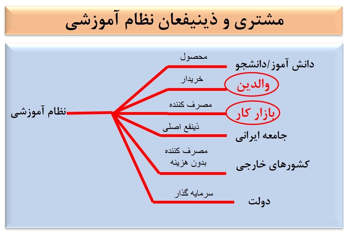 در واقع مصرفکننده نهایی نظام آموزشی بازار کار است در صورتی که جامعه، دولت، خانواده و شخص پرداخت کننده هزینه نظام آموزشی هستند اما در نهایت بازار کار در این فرایند، مصرفکننده نهایی است. اینجا سوالی مطرح می شود که این مصرفکننده ازشخص آموزش دیده چه میخواهد؟ آیا از کتابهای درسی خوانده شده سوال میپرسد؟ پاسخ خیر است. بازار کار از دانشجو مهارت میخواهد و دانشی میخواهد که مرتبط با مهارت باشد و مهارتی که مرتبط با کار باشد.