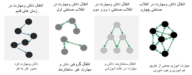 با گسترده شدن و عمیق تر شدن دانش بشری، مدل انتقال دانش از نسلی به نسل دیگر نیز تغییر کرد و از انتقال فرد به فرد به انتقال دانش از فرد به گروه یادگیرندگان در یک ساختار پلکانی تغییر یافت و به شکل امروزی آن تحت نام نظام آموزشی از ابتدایی تا سطوح عالی دانشگاهی سازماندهی شد و در قالب یک فرآیند ساختارمند، مستندسازی، کدگذاری، آموزش، آزمون برای قرنها ادامه داشته است، حتی در شرایطی که پایگاه دانش بشری از توانایی هر انسانی برای هضم و یادگیری همه ابعاد آن دانش نیزفراتر رفته است. این روشی است که تا ظهور انقلاب صنعتی چهارم تا حد زیادی در محدوده یک نوع دانش خاص کار کرد داشته است.