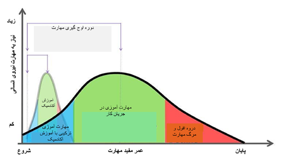 در انقلابهای صنعتی اول (بخار، و فناوری های مکانیکی) و دوم ( تقسیم کار برای تولید انبوه)، کارگران، اغلب در حین کار، آموزش می دیدند و بدلیل طولانی بودن دوره عمر مهارتهای فاسد شدنی، در بیشتر موارد، مادامالعمر باقی میماندند، فرا گیری مهارتها نیر بیشتر از طریق تقلید انجام می گرفت و معمولا بر یک سطح مهارت متمرکز بود. در انقلاب صنعتی سوم (مکانیزاسیون صنعتی) کارکنان باید برای مهارت داشتن در مسیر رسیدن به مدارج تحصیلی عالی قرار می گرفتند، زیرا کار از کار فیزیکی و معمولی به کار با معیار های علمی و دانش شناختی تغییر می کرد. کسب و کار ها در این دوره به افرادی نیاز داشت که ضمن دارا بودن دانش و مهارت فردی مورد نیاز روز سازمان،توانایی انتقال شایستگی های آموخته شده به محیط های کاری مجاور و نسل های بعدی نیز وجود داشته باشد. روشن است که این امر نیاز به سازو کاری خاص دارد و لذا در این دوره ما شاهد اوج گیری نهاد های آموزشی آکادمیک در شکل دانشگاه ها و موسسات آموزشی بوده ایم که عمدتا ضمن دارابودن مسئولیت در توسعه دانش در حوزه پژوهش و تولید فناوری های جدید، بتوانند دانش آموختگان مورد نیاز کسب و کار ها را تامین نماید. حال چنانچه فرد دانش آموخته در موقعیت کاری مناسب و مرتبط قرار می گرفت می توانست برای مدتی طولانی از دانش خود در قالب مهارت استفاده نماید
